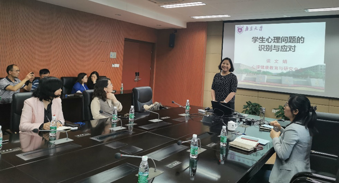 谈文娟首先与在场老师就“哪些情况属于心理健康问题”展开了热烈讨论,并以此唤醒老师们“关爱自己才能更好地爱别人”的意识。随后,谈文娟讲解了关于抑郁情绪、抑郁状态、抑郁症的相关知识,具体分析了空心病、精神分裂症、边缘型人格障碍、抑郁症、双相情感障碍等问题的表现症状及帮扶措施。最后,谈文娟从实际工作指导角度出发,传授了“心理危机的日常识别”“四位一体改善计划”等方面的经验。在交流讨论环节,老师们结合学生实际表现提出了心中的困惑,谈文娟一一耐心回应。在场教师纷纷表示受益匪浅,在今后的教学科研工作中将进一步加强人文关怀,促进学生心理健康素质与科学文化素质协调发展。