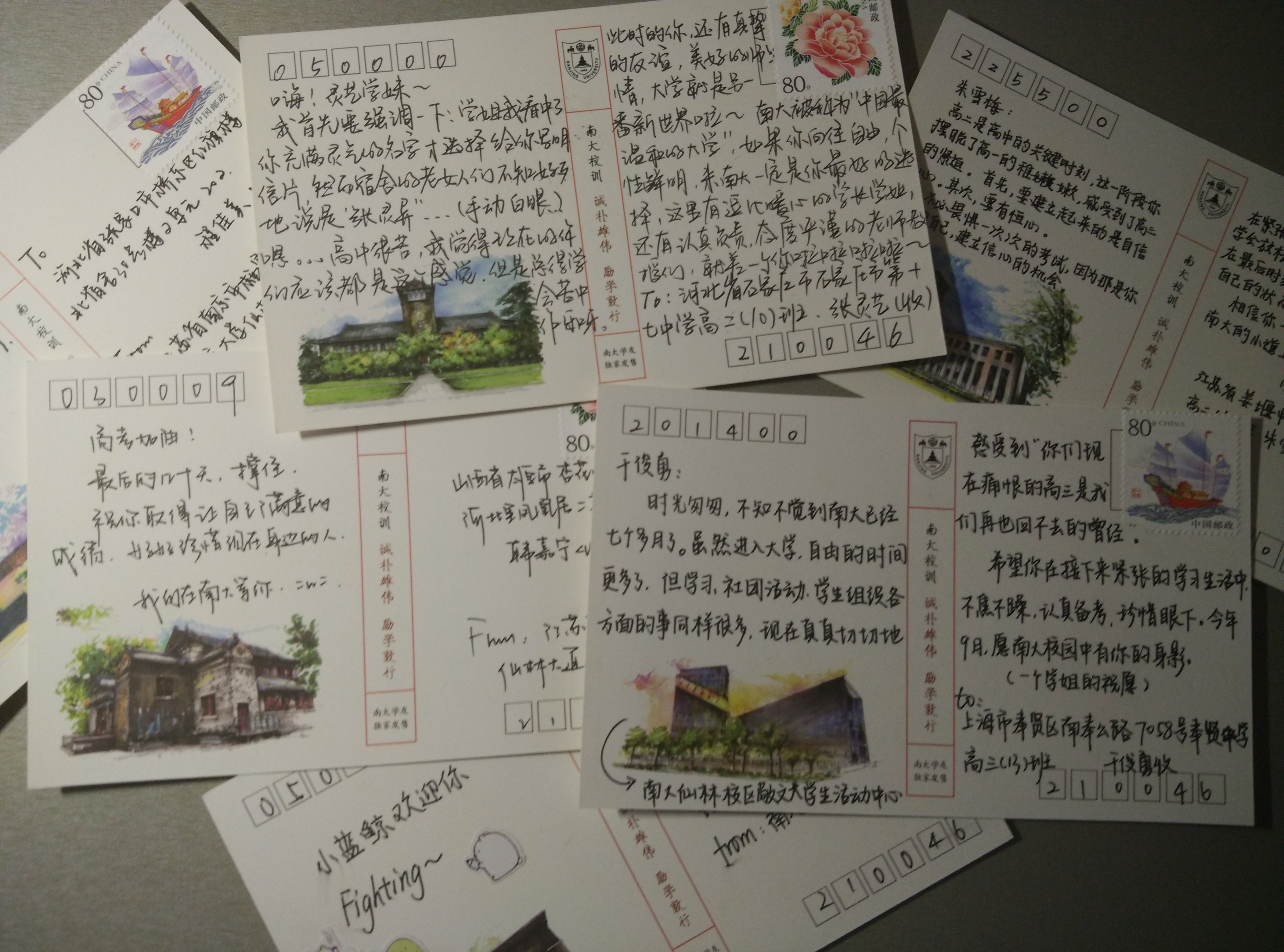 活动第一部分是大家寄回给自己母校学子的明信片,来自80多个地区的同学在明信片上写下满满的期待,希望收到这份心意的母校同学也能在今年的九月来到风景独好的仙林,在这里开启他们美好的大学生活。