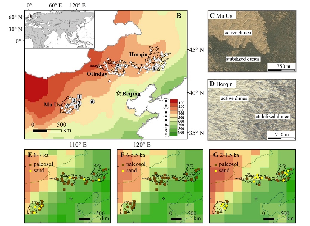 2016年起,团队徐志伟副教授、生科院徐驰教授联合国内外学者组成的多学科交叉研究团队,致力于探究沙丘双稳态的形成与演化机制研究。他们发现流动沙丘与固定沙丘的植被盖度和流动性水平差异很大,却能够在年降水量200-400 mm的环境中稳定共存。他们系统构建了我国北方沙地144处点位、500多个独立年龄的地层-年代数据库,发现沙丘双稳态在12000年以来始终存在,并且持续至今。随着气候环境的改变,沙地环境在局域和全域尺度上对季风变化存在非线性响应,并与多重尺度上的正反馈过程有关。这一研究成果有助于理解目前沙漠沙地环境变化机理以及预测未来趋势,在澄清干旱区土地快速退化的触发条件并进行早期预警等方面也可以发挥关键作用(图2)。2020年2月27日,研究成果以“Critical transitions in Chinese dunes during the past 12,000 years”为题发表在Science子刊《Science Advances》上。