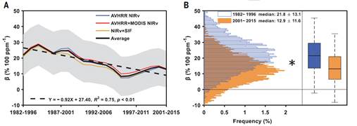 图1全球陆地生态系统CO2施肥效应的长期时间变化趋势(A)以及1982-1996和2001-2015年全球CO2施肥效应的直方图。