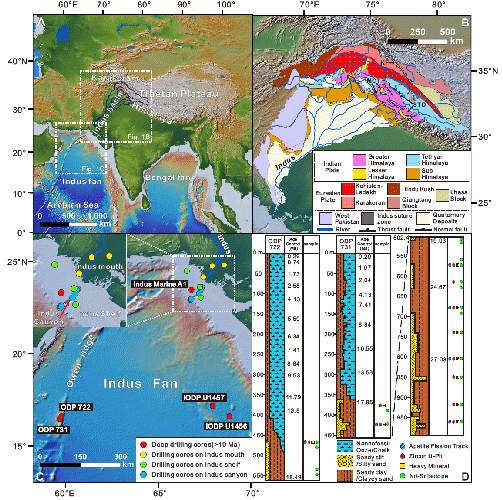 亚洲南部高耸的喜马拉雅-喀喇昆仑山及其南边深陷的阿拉伯海-孟加拉湾,组成了地球表层高程差最大的地形地貌。特殊的地形地貌影响着大气环流型式和大江大河发育,孕育了独有的亚洲季风气候和河流水系格局。长期以来,关于喜马拉雅-喀喇昆仑山脉生长与阿拉伯海-孟加拉湾的形成,吸引着国内外诸多科学家,并取得不少研究进展。然而,关于喜马拉雅-喀喇昆仑山系隆升、印度河演变、阿拉伯海沉积以及季风气候变化等重要科学问题,没有获得一致认识,亚洲南部地貌起源与演变还有诸多不解之谜。最近, 91av 鹿化煜教授课题组结合在阿拉伯海大洋钻探(ODP)获得的宝贵样品,研究喜马拉雅-喀喇昆仑山与阿拉伯海演变过程,发表了以 91av 博士生冯晗同学为第一作者的论文“Erosion of the Himalaya-Karakoram recorded by Indus Fan deposits since the Oligocene”, 揭示了亚洲南部山脉-流域的起源和演化,揭示了喜马拉雅-喀喇昆仑山和阿拉伯海体系演变过程,受到同行专家的高度肯定。