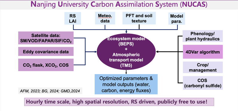 [1] Mousong Wu*, Fei Jiang, Marko Scholze, Deliang Chen, Weimin Ju, Songhan Wang, Thomas Kaminski, Zhengyao Lu, Michael Vossbeck, Minjie Zheng. Regional Responses of Vegetation Productivity to the Two Phases of ENSO [J]. Geophysical Research Letters, 2024, 51(8) [2] Huajie Zhu, Mousong Wu*, Fei Jiang, Michael Vossbeck, Thomas Kaminski, Xiuli Xing, Jun Wang, Weimin Ju, Jing M. Chen. Assimilation of carbonyl sulfide (COS) fluxes within the adjoint-based data assimilation system – Nanjing University Carbon Assimilation System (NUCAS v1.0) [J]. Geoscientific Model Development, 2024, 17(16): 6337-6363 [3] Xiuli Xing, Mousong Wu*, Huajie Zhu, Wenzhuo Duan, Weimin Ju, Xiaorong Wang, Youhua Ran, Yongguang Zhang, Fei Jiang. Optimized Gross Primary Productivity Over the Croplands Within the BEPS Particle Filtering Data Assimilation System (BEPS_PF v1.0) [J]. Journal of Advances in Modeling Earth Systems, 2024, 17 [4] Xiuli Xing, Mousong Wu*, Wenxin Zhang, Weimin Ju, Torbern Tagesson, Wei He, Songhan Wang, Jun Wang, Lu Hu, Shu Yuan, Tingting Zhu, Xiaorong Wang, Youhua Ran, Sien Li, Chunyu Wang, Fei Jiang. Modeling China’s terrestrial ecosystem gross primary productivity with BEPS model: Parameter sensitivity analysis and model calibration [J]. Agricultural and Forest Meteorology, 2023, 343: 109789 [5] Wei He, Fei Jiang, Mousong Wu*, Weimin Ju, Marko Scholze, Jing M Chen, Brendan Byrne, Junjie Liu, Hengmao Wang, Jun Wang, Songhan Wang, Yanlian Zhou, Chunhua Zhang, Ngoc Tu Nguyen, Yang Shen, Zhi Chen. China's Terrestrial Carbon Sink Over 2010–2015 Constrained by Satellite Observations of Atmospheric CO2 and Land Surface Variables [J]. Journal of Geophysical Research: Biogeosciences, 2022 [6] Chunyu Wang, Sien Li, Mousong Wu*, Per-Erik Jansson, Wenxin Zhang, Hongxing He, Xiuli Xing, Danni Yang, Siyu Huang, Dekui Kang, Yujiang He. Modelling water and energy fluxes with an explicit representation of irrigation under mulch in a maize field [J]. Agricultural and Forest Meteorology, 2022 [7] Mousong Wu, Qiang Zhao, Per-Erik Jansson, Jingwei Wu, Xiao Tan, Zheng Duan, Kang Wang, Peng Chen, Minjie Zheng, Jiesheng Huang, Wenxin Zhang. Improved soil hydrological modeling with the implementation of salt-induced freezing point depression in CoupModel: Model calibration and validation [J]. Journal of Hydrology, 2020 [8] Mousong Wu, Marko Scholze, Michael Voßbeck, Thomas Kaminski, Torbern Tagesson. Using SMOS soil moisture data combining CO2 flask samples to constrain carbon fluxes during 2010–2015 within a Carbon Cycle Data Assimilation System (CCDAS) [J]. Remote Sensing of Environment, 2020, 240 [9] Mousong Wu, Youhua Ran, Per-Erik Jansson, Peng Chen, Xiao Tan, Wenxin Zhang. Global Parameters Sensitivity Analysis of Modeling Water, Energy and Carbon Exchange of an Arid Agricultural Ecosystem [J]. Agricultural and Forest Meteorology, 2019, 271: 295-306 [10] Mousong Wu, Jingwei Wu, Xiao Tan, Jiesheng Huang, Per-Erik Jansson, Wenxin Zhang. Simulation of dynamical interactions between soil freezing/thawing and salinization for improving water management in cold/arid agricultural region [J]. Geoderma, 2019, 338: 325-342 (2)授权专利技术及软著 [1] 吴谋松,胡路,居为民,江飞. 一种基于植被水力传输的碳水通量模拟方法及系统. CN119227588B(作者排名1/4) [2] 伍靖伟,吴谋松,谭霄,黄介生,郑轩,刘洁颖. 一种监测高含盐量土壤中水分和盐分的时域反射仪探头. CN201320183380.8(作者排名2/6) [3] 谭霄,吴谋松,伍靖伟,黄介生,李大成,权维新,刘洁颖,郑轩. 一种应用于高含盐量土壤的热时域反射仪探头. CN201320658007.3(作者排名2/8) [4] 谭霄,王康,吴谋松,黄介生,伍靖伟,刘俊伍,李大成. 一种适于扩展的高含盐土壤水分测量的TDR系统方法. CN201410017191.2(作者排名3/7) [5] 吴谋松,江飞,邢秀丽,居为民,朱华杰. 基于变分法的多源观测数据同化软件[简称:NUCAS_Site] V1.0, 2022SR1437766, 原始取得, 全部权利, 2022-7-14 [6] 吴谋松,朱华杰,江飞,邢秀丽,居为民. 基于羰基硫与日光诱导叶绿素荧光的水碳通量优化方法, 2023-01-17, 中国, 2023100650456 |