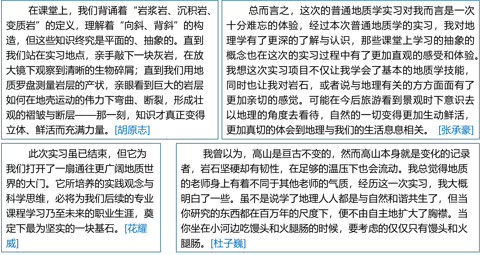 这14天的旅程,既是一次知识的深刻拓展,也是一次人格与意志的锤炼。它让学生们在与大地的亲密接触中,体悟到科学探索的乐趣与意义,心中播下热爱地学、追求真理的种子。那一层层岩石的纹理,犹如他们心中留下的烙印,成为终身难忘的“地质记忆”(图6)。