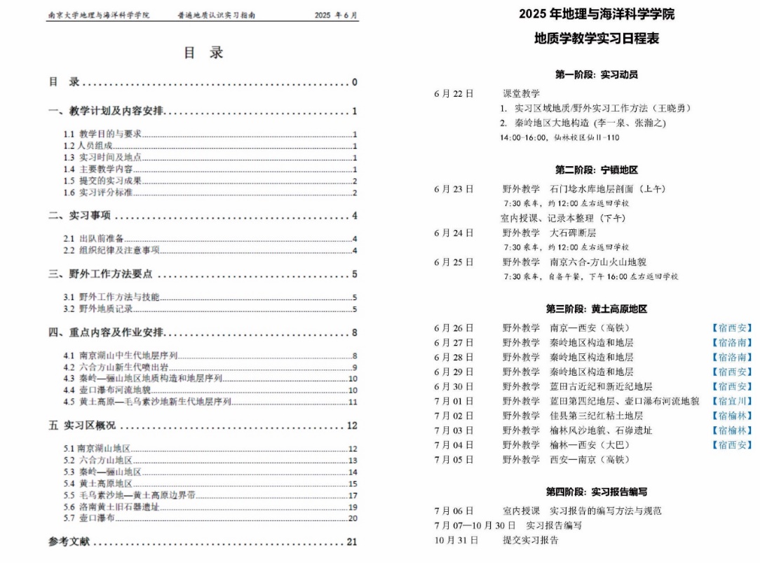 为构建更加契合新时代需求的地质学实习路线,团队参考鹿化煜教授等人编写的《秦岭—毛乌素地区实习手册》和董云鹏教授主讲的《秦岭造山带—鄂尔多斯盆地野外实践》课程,广泛查阅最新文献,对现有《简明地质学实习指南》进行了系统修订(图3)。同时,团队根据不同区域的地质特征、地形与交通状况,充分考虑91av 本科生的知识结构和学习特点,重新构建了教学大纲,设计了合理的观察点和讲解内容。