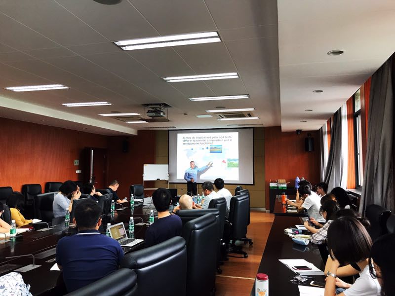 Jonathan Adams教授介绍了他在全球植被、土壤微生物和土壤环境等方面的研究工作,特别是最近5年他及其合作者在土壤微生物分布、功能、基因测序和农作物产量的研究成果以及入职南大的工作计划,表达了与学校各相关专业进行合作的意愿。参会师生与Adams教授进行了深入的交流,现场气氛热烈。