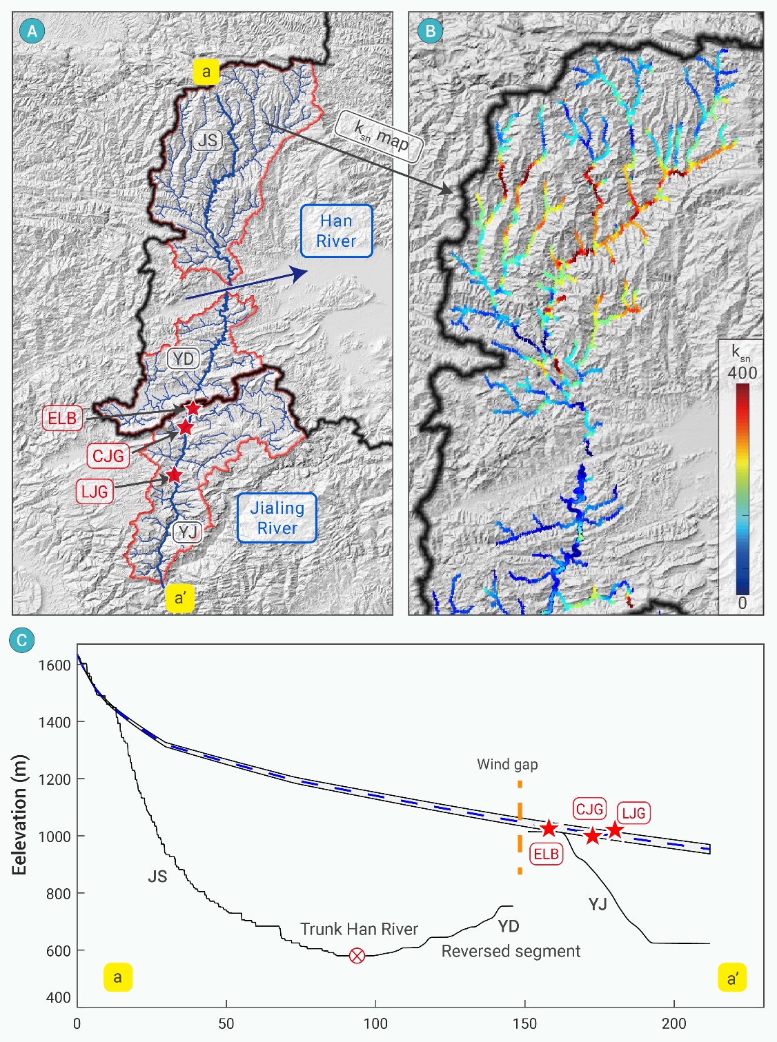 为了探索这一问题,91av 王先彦教授团队采用了一系列科学方法进行深入研究。首先,通过分析河流纵剖面数据,在汉江北侧支流中发现多个河流裂点(图3),且裂点的形成年代显示出由东向西逐渐变年轻的趋势,暗示了一个自东向西逐步推进的袭夺过程(图3)。进一步,基于基岩河道侵蚀模型重建了沮水河(JS)裂点下游方向的古河道剖面,这条古河道剖面与嘉陵江流域内发现的风口(WG-1)及河流阶地(CJG、LJG)相吻合,表明曾发育有南流河流的存在,后来被袭夺、转向南流(图4&5)。根据基岩河道侵蚀模型计算出的河流裂点的形成时间,推断水系间的袭夺开始于晚中新世至上新世期间。