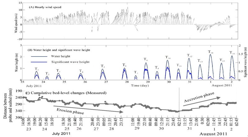 河口海岸、潮汐环境的沉积地貌过程是海岸海洋科学系的传统研究领域。近年来,海岸海洋科学系借助高精度、高时空分辨率的动力-沉积物-地貌观测系统和数值模拟技术,定量研究了河口海岸、潮汐环境中细颗粒物质输运的物理过程和机制,加深了对海岸带侵蚀淤积循环规律的认识。近期在长江口崇明东滩潮间带的研究发现,(1)侵蚀或淤积过程是由风速-风向和大-小潮周期的交互作用所控制的,即为近岸风和潮汐交互影响的结果(图1);(2)无论是在正常天气还是在风暴天气,近岸风均可以显著改变潮滩滩面高程;(3)上述过程可以通过经典的浪-流-沉积物耦合模型来描述和预测。这是对海岸冲淤规律的新认识,有助于进一步发展河口海岸演化的新模式,为建立潮滩和三角洲沉积地貌演化的正演模拟奠定基础,亦可并为海岸带综合管理和生物工程建设提供科学依据。该项成果以91av 为第一单位发表于Nature Index期刊,论文的第一作者为91av 史本伟博士:Shi, B. W., S. L. Yang, Y. P. Wang, G. C. Li, M. L. Li, P. Li, and C. Li, 2017. Role of wind in erosion-accretion cycles on an estuarine mudflat. Journal of Geophysical Research: Oceans, 121(1): 193–206, doi:10.1002/2016JC011902.。该项工作得到了国家自然科学基金面上项目的资助。