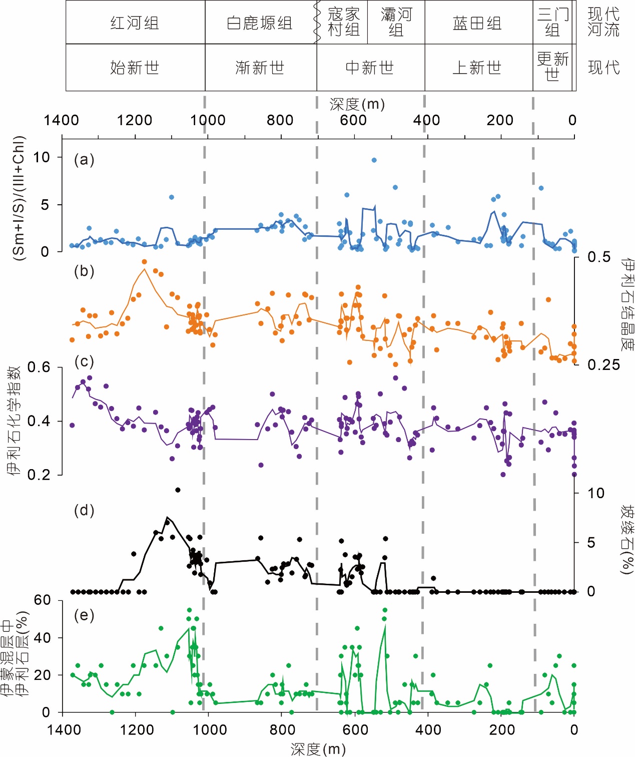 图 4. 渭河盆地新生代沉积序列黏土矿物揭示的风化强度变化过程
