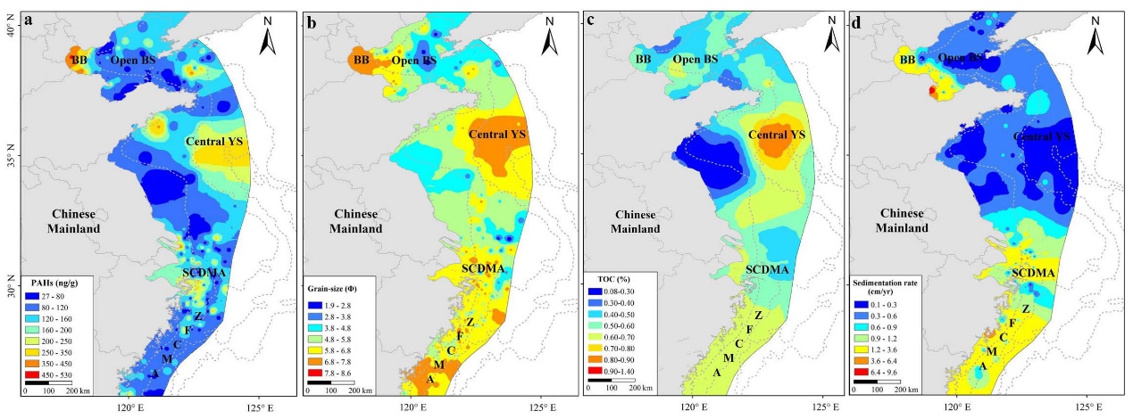 图 1 中国东部海域表层沉积物PAHs浓度(a), 粒度(b), 有机碳含量(c)和沉积速率(d)分布图