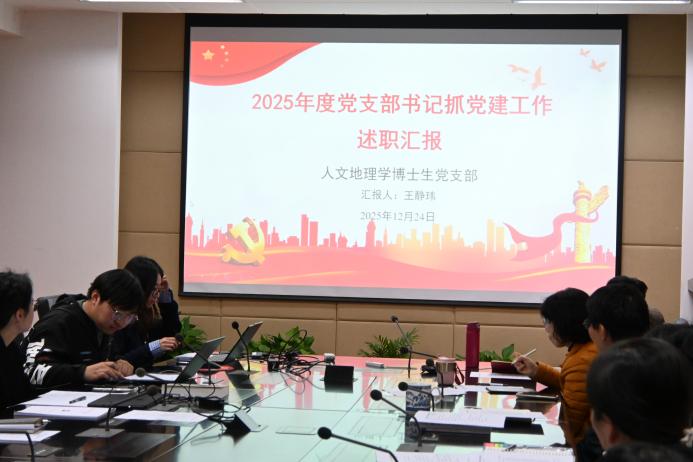 院党委书记鹿化煜作总结讲话。他首先肯定了各党支部一年来的工作,各位党支部书记切实履行支部党建工作“第一人”责任,坚持围绕中心工作抓党建,有效地结合支部特点,开展丰富多彩的支部活动,切实增强支部的组织力与凝聚力,推动党的建设工作取得了一定成效。他强调,各党支部在新的一年里,一是要强化主动学习,筑牢政治基础;二是要将党建引领与学科发展深度融合,打造支部活动品牌,凸显地理学科特色;三是要坚持实事求是的作风,重视支部党建活动的实效。