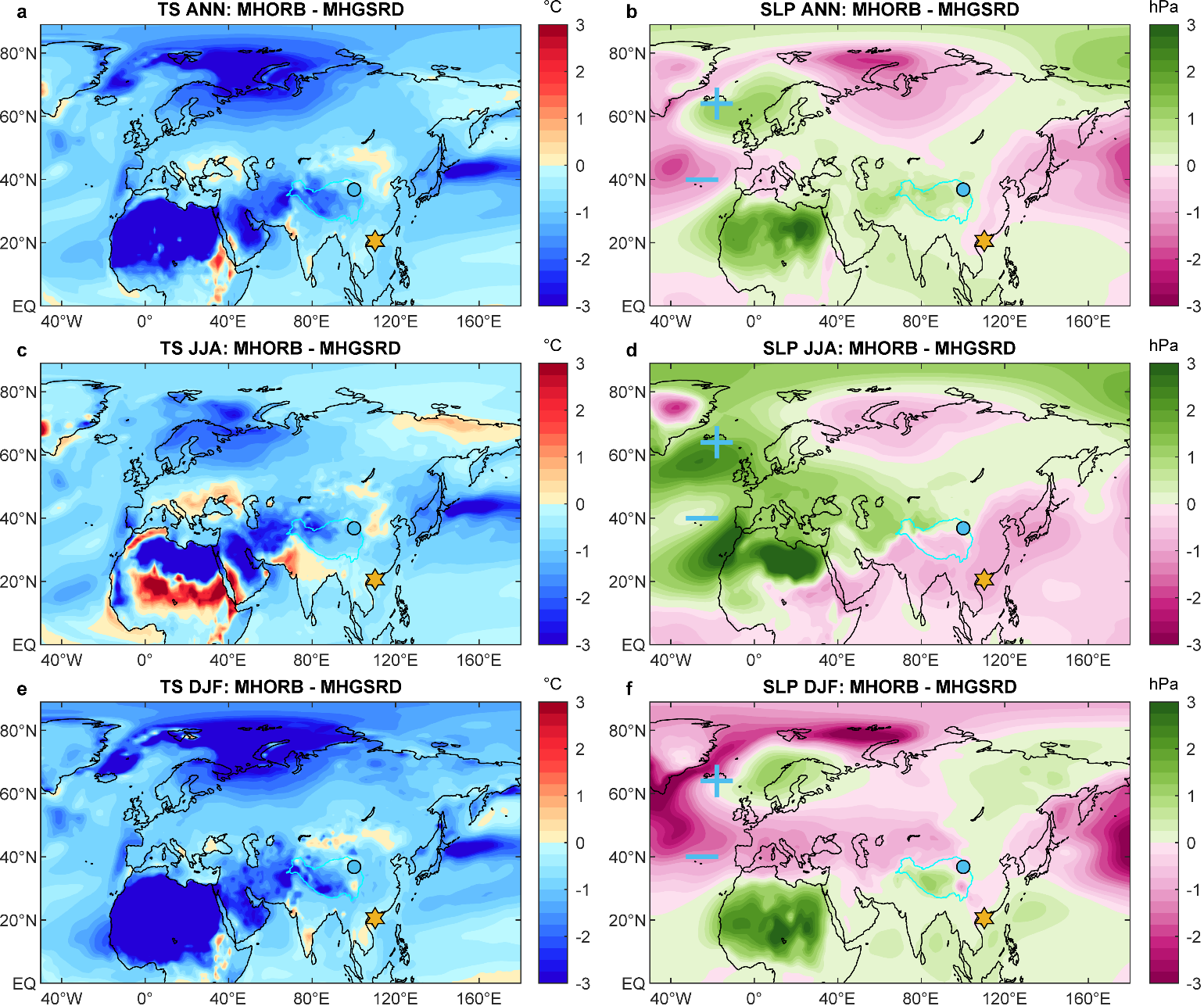 撒哈拉植被突变主要通过植被-粉尘-冰冻圈反馈影响东亚夏季风降水。撒哈拉植被变化直接影响撒哈拉地区的地表反照率和粉尘排放,从而影响全球温度变化,进而影响大气环流和降水。在本研究中,鹿化煜教授团队创新性地提出撒哈拉植被变化影响东亚夏季风降水的新途径:北大西洋涛动(NAO)和青藏高原。气候模拟显示,撒哈拉植被消亡能够导致北极地区和青藏高原降温。北极地区降温驱动NAO向负位相转变,西风带南移,与此相关的大气波列向东传播,影响东亚夏季风降水。青藏高原是驱动亚洲夏季风的热源,青藏高原降温直接降低海陆热力梯度,从而减弱东亚夏季风环流,减少东亚夏季风降水。