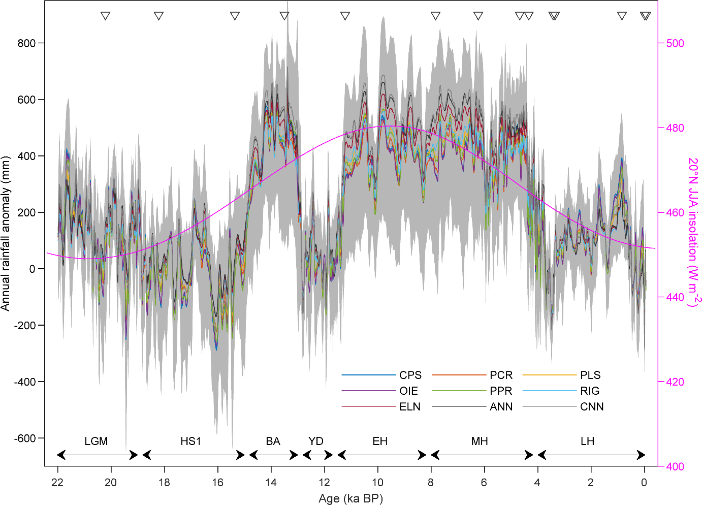 图1 基于多种算法重建的过去22000年东亚夏季风降水量变化。