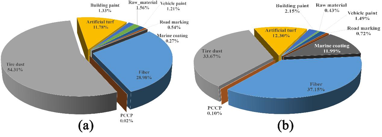图1 2015年中国大陆地区初级源微塑料各类源的排放组成(a)及进入水生系统后类源组成(b)