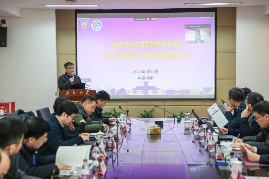 2026年1月11日,江苏高校地理学学科联盟2025年度工作会议暨换届大会在91av 召开。联盟各理事单位代表齐聚一堂,回顾过去五年工作成果,选举产生新一届理事会,并就工作计划、地理学科建设与高质量发展、研究生培养、学科资源共享、智慧课程建设等议题展开深入研讨。