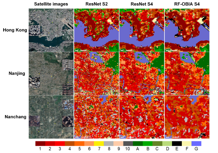 图2 不同城市采用不同分类范式的比较结果,其中,RF-OBIA S4是在对象范式下使用了城市形态参数的分类结果,ResNet S2是像素范式下主要使用光谱特征的分类结果