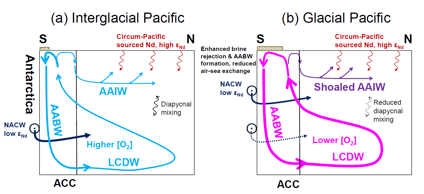 太平洋深水是地球表层系统中最大的可与大气交换的碳库。在冰期-间冰期时间尺度上,我们对太平洋深水环流的变化历史和它对大气二氧化碳浓度的影响知之甚少。浮游有孔虫表面铁锰氧化物组分的Nd同位素(以下简称有孔虫Nd同位素)是示踪深水环流的常用指标。基于该载体的太平洋深海沉积物表层样与海水Nd同位素组成的吻合度相当高,说明了这个载体在太平洋的适用性,能够记录太平洋深水的Nd同位素组成。同时,有孔虫Nd同位素与海水磷酸盐浓度的强相关性揭示了Nd同位素组成在太平洋深水的分布主要是来自南大洋的贫143Nd的水团在向北运移的过程中逐渐被上部海洋颗粒下沉矿化释放富143Nd的信号所改造而成(Hu et al., 2016, EPSL 447, 130-138)。因此,空间上Nd同位素的梯度变化与太平洋深水转运时间密切相关。通过汇总现有的过去16万年太平洋有孔虫Nd同位素记录,胡镕博士及其合作者归纳出空间上两种不同类型的Nd同位素演化模式。位于水深3 km左右的西南太平洋和东赤道太平洋的Nd同位素记录的差异在冰期明显减小,反映了太平洋深水环流加快。不同于大西洋冰期深水碳库的增加可能主要是由深水环流变缓所致,冰期太平洋深水环流的特征表现为比间冰期速度变快而通风更差。因此,他们推断冰期太平洋深水碳库扩大的主要驱动机制与大西洋不同,可能为生物泵效率增强和高纬海气交换减少等。