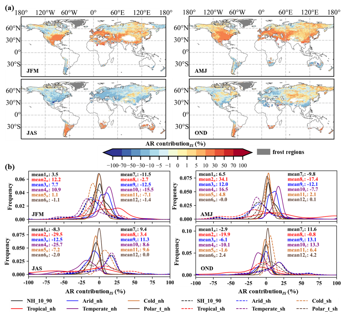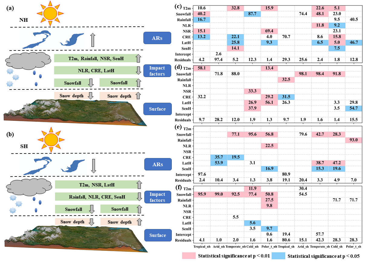 在全球气候变暖背景下,陆地积雪变化对全球水资源和地球系统能量平衡有着深远影响。随着极端天气事件频发,越来越多的研究关注极端天气系统,尤其是大气河(ARs)对积雪变化的影响。然而,现有的研究通常只关注局部或区域层面的情况,限制了对AR与积雪相互作用的全球性理解。