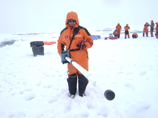 柯长青教授在北极长期冰站测量海冰厚度(2010)