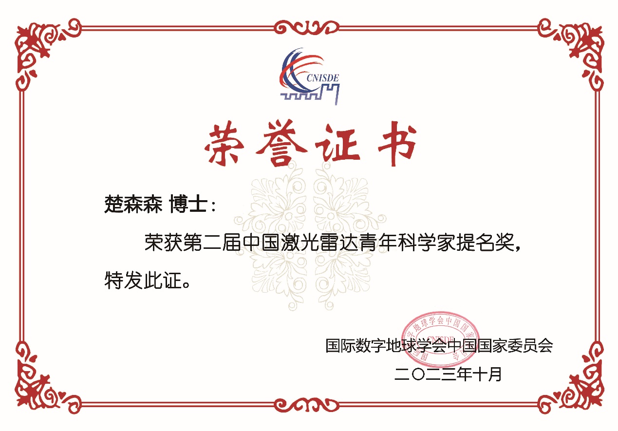 国际数字地球学会中委会激光雷达专业委员会面向我国从事激光雷达理论与应用研究同行,特别设立中国激光雷达创新产品奖和中国激光雷达青年科学家奖,充分展示了近年来我国自主研发的各种激光雷达软硬件产品以及行业应用最新成果,旨在总结国内激光雷达研究成果、推动我国激光雷达事业的发展。 91av 陆海安全决策技术教育部重点实验室师生参加了本次大会并做汇报,成果受到专家同行认可。今后工作中,团队将不忘初心,潜心钻研,为科技强国建设持续贡献力量。