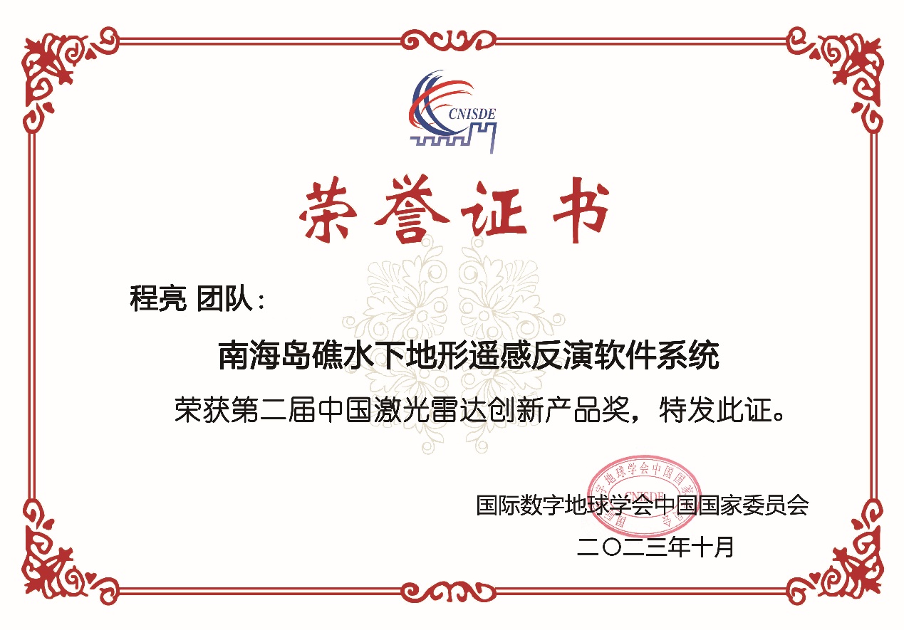 2023年10月20-22日,第七届全国激光雷达大会在河南理工大学成功举办, 91av 程亮教授团队研制的“南海岛礁水下地形遥感反演软件系统”获中国激光雷达创新产品奖(共5项),楚森森博士获中国激光雷达青年科学家提名奖。
