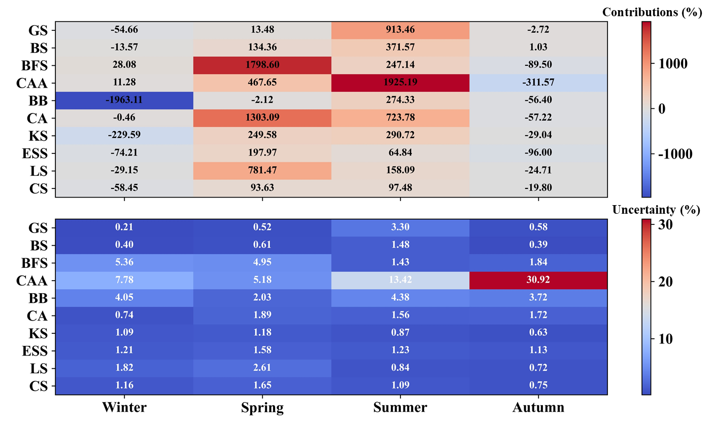 图2北极不同海区AR发生对积雪深度变化的贡献(%)和相应的不确定性(%)。注:正(负)贡献值表明,AR频率的增加促进了积雪深度的减少(增加)。