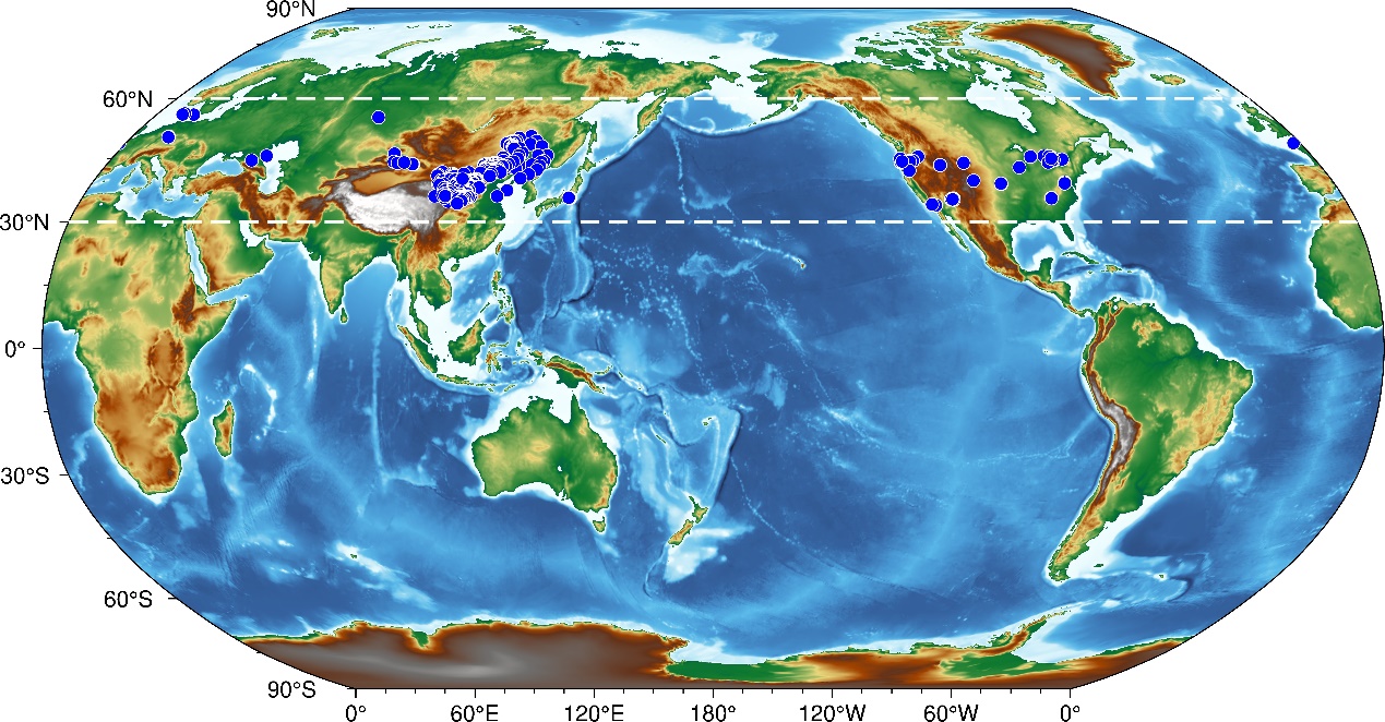 图1 筛选的792个北半球中纬度表土有机碳同位素样点空间分布