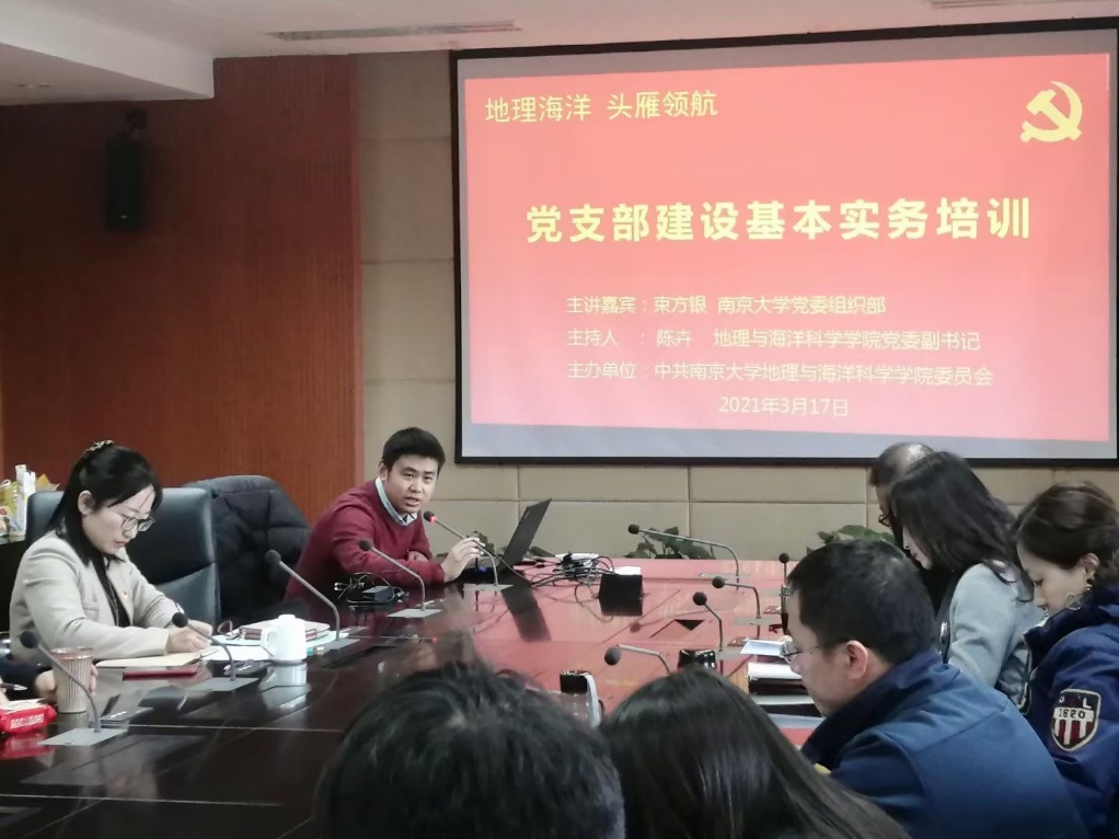 为推动全面从严治党向基层延伸,更好地发挥基层党支部的战斗堡垒作用和党员骨干的先锋模范作用,3月17日,91av 党委举办了“强基固本筑堡垒,提质增效迎华诞”党支部建设基本实务培训会,本次活动为“地理海洋 头雁领航”党员骨干能力提升系列活动的第八场。91av 党委组织部束方银老师应邀主讲,学院党委副书记陈卉主持会议,学院教职工与学生党支部书记、委员40余人参加了本次会议。
