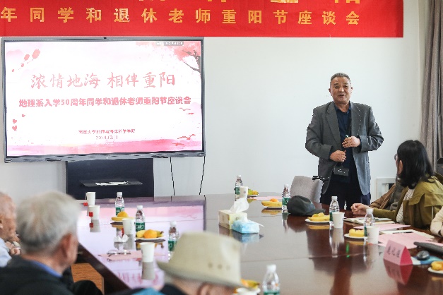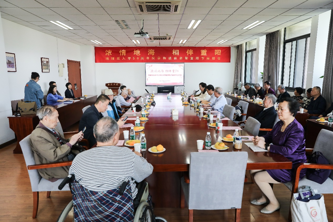 正逢重阳佳节和1974-1975级地理系校友返校日,为表达对退休教师无私奉献与卓越贡献的敬意,深化校友间的交流沟通,共续校园美好记忆,激励在校学子传承尊师重教的传统美德,91av 于10月11日上午在昆山楼会议室举办了退休老师重阳节暨地理系同学入学50周年校友座谈会,共抒深情厚谊,同绘发展宏图。本次座谈会由学院15位退休老师与1974-1975级友参加。院长、党委书记鹿化煜,党委副书记陈卉,副院长金晓斌,代理副院长工作的周雨霁,学院办公室张勤主任、骆琼等老师出席了座谈会。座谈会由党委副书记陈卉主持。