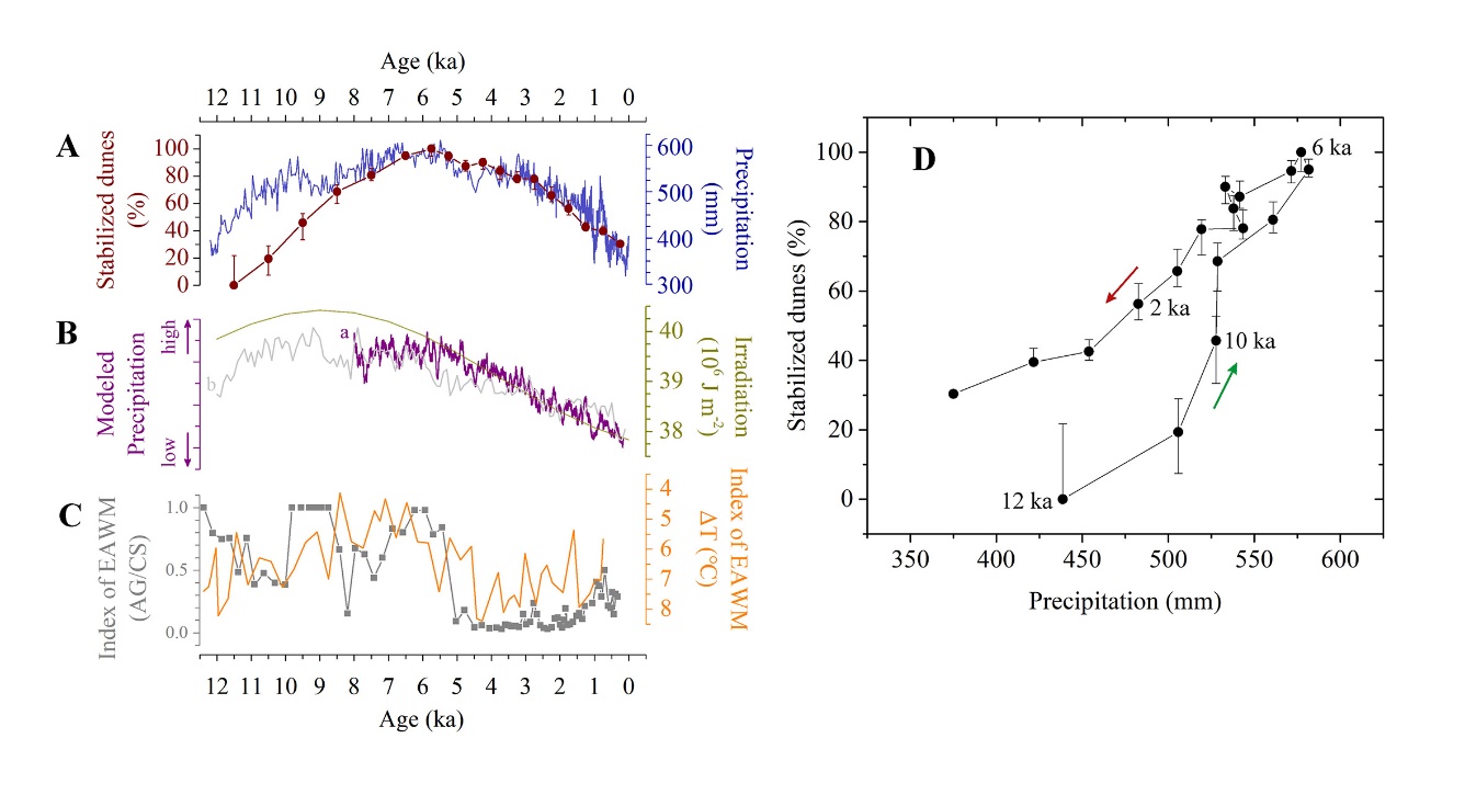 围绕干旱区环境变化,91av 地理学院鹿化煜教授的研究团队在我国北方沙漠沙地开展了二十年的研究工作。近年来,在科技部重点研发计划和国家自然科学基金等项目的支持下,他们对多个沙漠沙地开展了“拉网式”考察和大量样品采集、测试分析,构建了近百个有精确年代控制的风沙沉积记录,取得了一系列科研成果。2016年起,该团队徐志伟博士等与91av 生科院徐驰教授团队协同美国、荷兰、以色列以及国内多个高校的学者组成的多学科联合团队,针对我国北方半干旱地区的主要沙地(包括毛乌素沙地、浑善达克沙地和科尔沁沙地等)144处风沙沉积进行了基于过程分析的点位特异性重建与集成,利用500多个地层-独立年代数据和古气候重建-模拟资料,获得了这些沙地过去一万两千年的环境变化历史(分辨率达到五百到一千年)。研究发现,我国北方沙地在过去一万两千年以来就存在与现今类似的流动沙丘与固定沙丘共存的现象,并且在距今六千年前后流动沙丘面积最少。受到季风降水变化的影响,在局部沙丘状态(流动或固定)的变化在较短时间内发生,表现出明显的突变特征,但突变发生的时间节点具有显著的不同步特征,其演化轨迹也具有鲜明的空间异质性。沙丘双稳态格局的形成及状态突变主要与植被、土壤与风沙活动之间的多种正反馈作用有关,并且受到生态系统内部过程的调节。在全域尺度上的重建结果表明,由于局部空间异质性特征相互抵消,这些沙地的总体状态演化表现为渐变特征,并且与季风降水存在较为明确的定量关系(但仍然存在迟滞现象)。这一研究成果有助于理解目前我国北方沙漠沙地环境变化机理以及预测区域环境变化趋势。这项研究凸显出考虑空间尺度和地表圈层相互作用在干旱区地貌发育和环境变化研究中的重要性,同时为澄清撒哈拉沙漠等全球其它干旱区环境突变和渐变的历史过程和机制提供了重要参考。