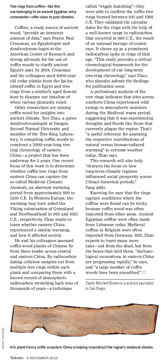 近日, 91av 杨保教授团队的研究成果获得国际权威学术期刊《科学》(Science)新闻版块(News)关注,并以《古代棺木年轮为洞悉地球过去提供线索》(“Tree rings from ancient coffins offer clues to Earth’s past”)为题进行专题报道。