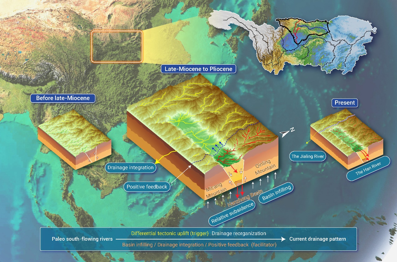 图1. 我国南北气候过渡带-秦岭南坡水系重组:中新世至上新世期间秦岭地区差异性抬升、汉中盆地断陷导致与南流的古长江相对应的平形状水系被古汉江自东向西逐渐袭夺,并在上新世形成现代水系格局。