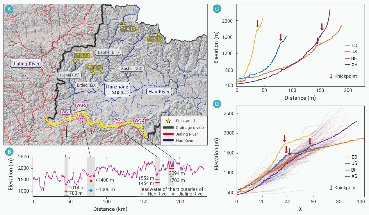 水系重组对地表水资源和沉积物输送有显著影响,进而影响区域地貌、生态环境及古人类迁徙和扩散等。作为全球大江大河发源地的高原地区构造活动复杂、气候分异强,水系结构复杂多变,尚缺乏深入理解。本文以我国南北气候过渡带-秦岭地区汉江和嘉陵江为例,探讨了山体生长-盆地沉陷-地表侵蚀作用下水系重组过程及驱动机制。