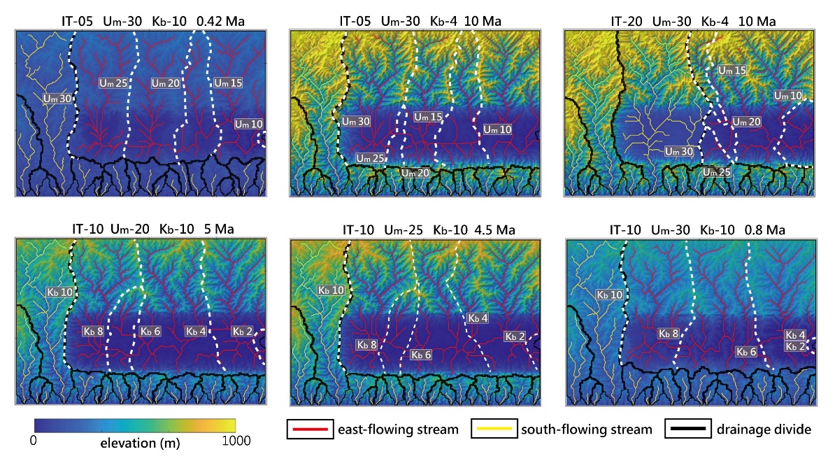 图6. 不同山体抬升和汉中盆地断陷场景下,东流河流(汉江)自东向西逐渐袭夺南流水系(古嘉陵江)过程的模拟