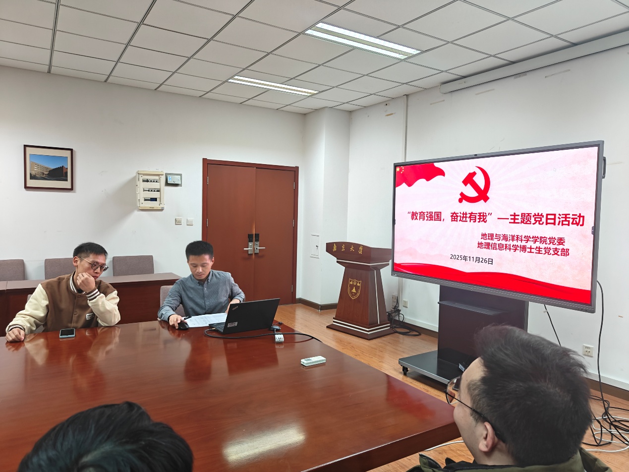 2025年11月26日,中共91av 地理信息科学博士生党支部举办“教育强国,奋进有我”主题党日活动。本次活动以深入学习贯彻习近平新时代中国特色社会主义思想为主线,紧密围绕党的二十大及二十届四中全会精神,结合地理信息科学、遥感科学等学科特色,引导青年博士生党员坚定理想信念、恪守科研诚信、服务国家战略。