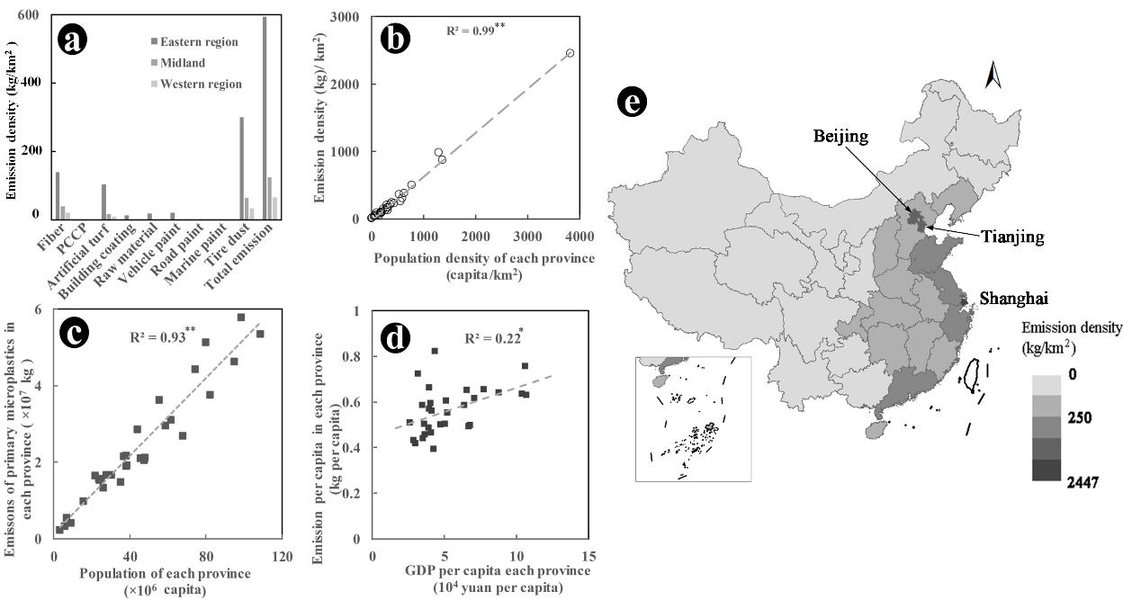 图2 2015年初级源微塑料排放特征(b~d)及排放密度空间差异(a和e)