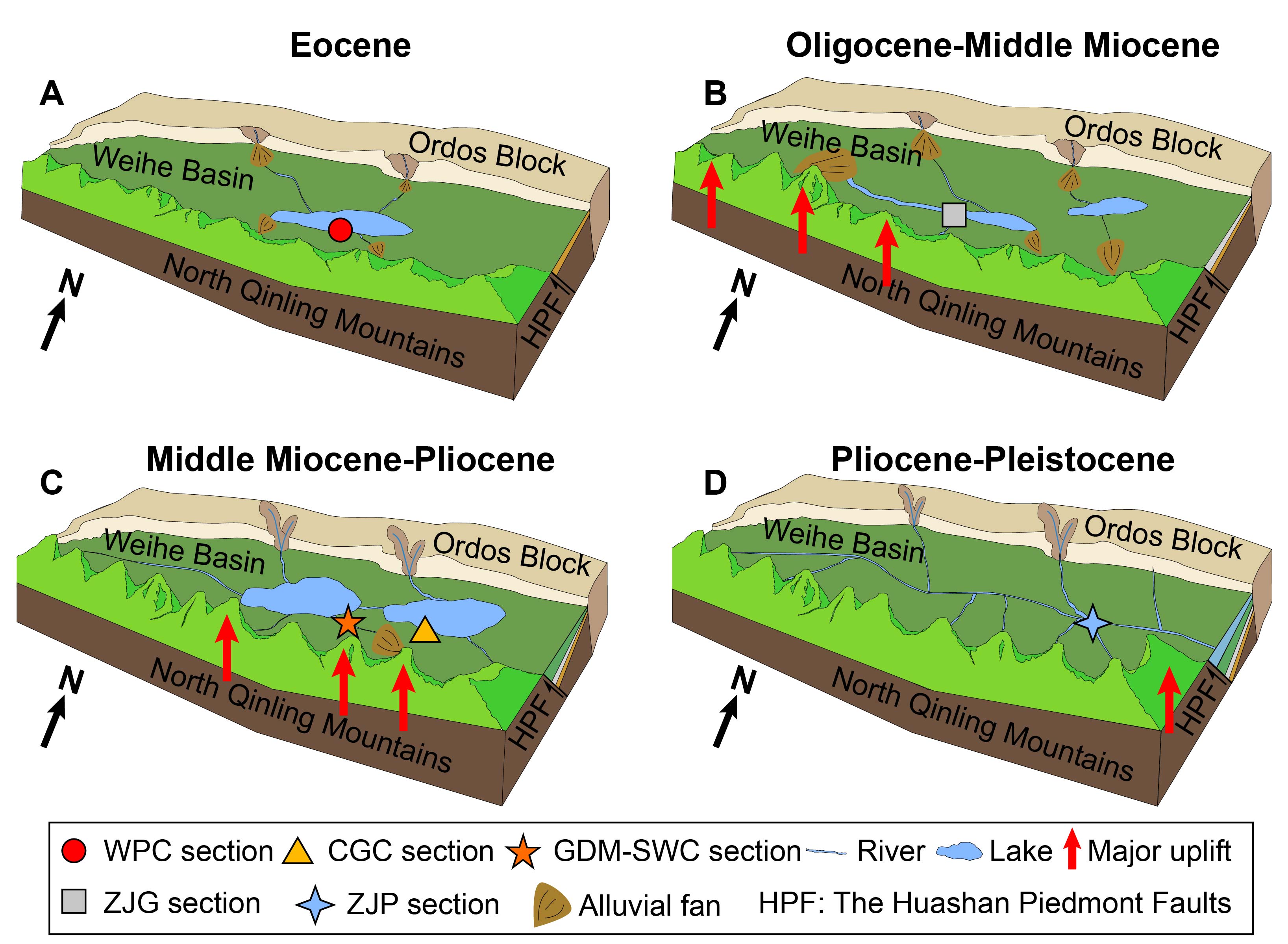 研究发现,始新世渭河盆地南部沉积物源以周缘区域的混合为主,表明这一阶段秦岭地貌抬升相对缓慢,未在地形上形成与周围地区的显著差异。在渐新世,盆地南部沉积由浅湖相转为滨湖相,沉积物源中北秦岭西部的太白山及周缘区域的物质贡献开始增加,指示北秦岭西部在该时段剥露抬升。中中新世,盆地南部沉积物源开始出现大量的华山岩体的物质贡献,且沉积古水流方向显示自东南向西北的流向,沉积相由湖相转为山前冲积扇相,指示了该时期华山岩体的抬升剥露。晚上新世-更新世,盆地南部沉积物源转为东部的小秦岭物质贡献为主,指示该时期北秦岭地貌生长向东扩展的过程(图2、3)。