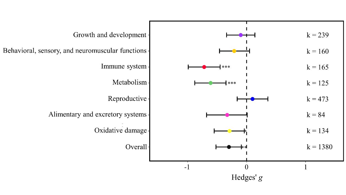在此背景下, 91av 邹欣庆教授团队选择鱼类为目标研究对象,溶解态为污染物存在形式,进行了一项荟萃分析,定量总结全球文献中现有的实验证据,并使用效应大小估计器来确定毒性的变化(方向和大小)以及对生物功能和系统的影响。研究发现在环境MP浓度的背景下,共存污染物溶液中MP的存在显著增加了对鱼类的毒性,具体而言,MPs会增加对免疫系统、代谢和氧化损伤的负面影响,但对生长和发育、行为和感觉及神经肌肉功能、消化和排泄系统、繁殖没有显著影响(图2)。此外,通过亚组/元回归分析探讨可能影响毒性的因素,发现毒性的变化与鱼类的生长阶段和MP大小有关,但与共存污染物类型、MP类型、有机污染物的logKow、暴露时间无关(图3)。最后,从MPs、共存污染物、环境因素和实验对象四个方面讨论了实验室研究与实际水生环境的差异,这些差异可能会影响评估的准确性。本研究为从复合污染的角度进一步了解MPs对水生生物的潜在影响提供了基础。此外,鉴于污染是渔业资源减少的重要因素,本研究可以为水生生态系统的保护和管理提供参考。