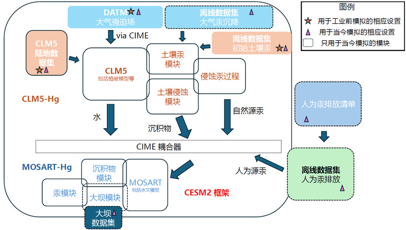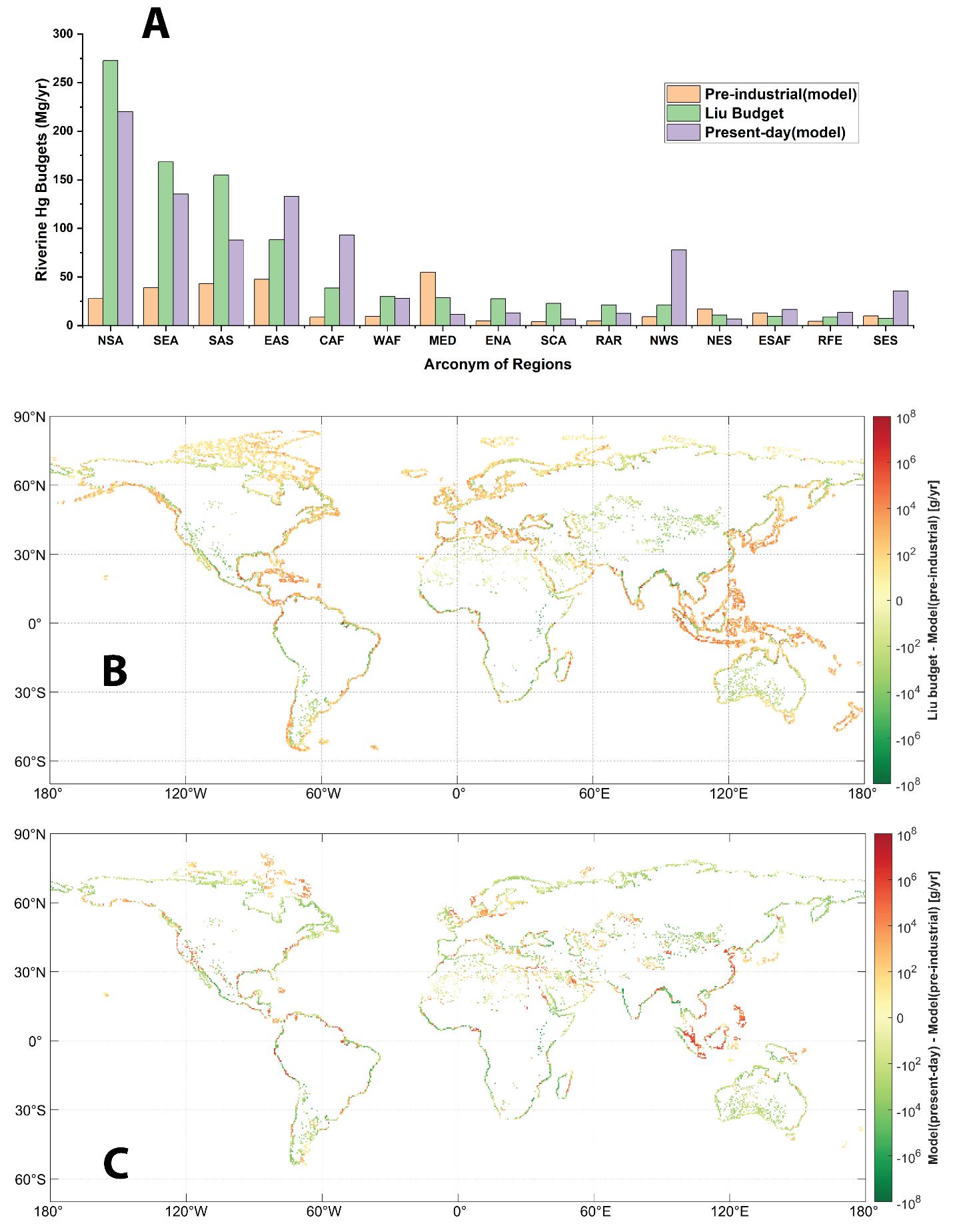 汞化合物是一类强效的神经毒素,主要通过食用鱼类威胁人类健康。河流不仅是饮用水和食物的重要来源,自工业革命(约1850年)以来,其汞浓度和向沿海地区的输出量也显著上升。然而,这一变化的时空格局尚未被系统研究,限制了对相关环境政策成效的评估。近日,91av 与大气科学学院联合课题组于国际刊物Science Advances发表题为“Human perturbations to mercury in global rivers”的研究论文。该文基于地球系统模式CESM2与E3SM开发全球河流汞模型,采用工业前时期气象驱动场来模拟工业前时期的河流总汞通量,并通过与现代观测估算和模拟进行深入对比,系统量化了近现代人类活动对河流汞循环的扰动。