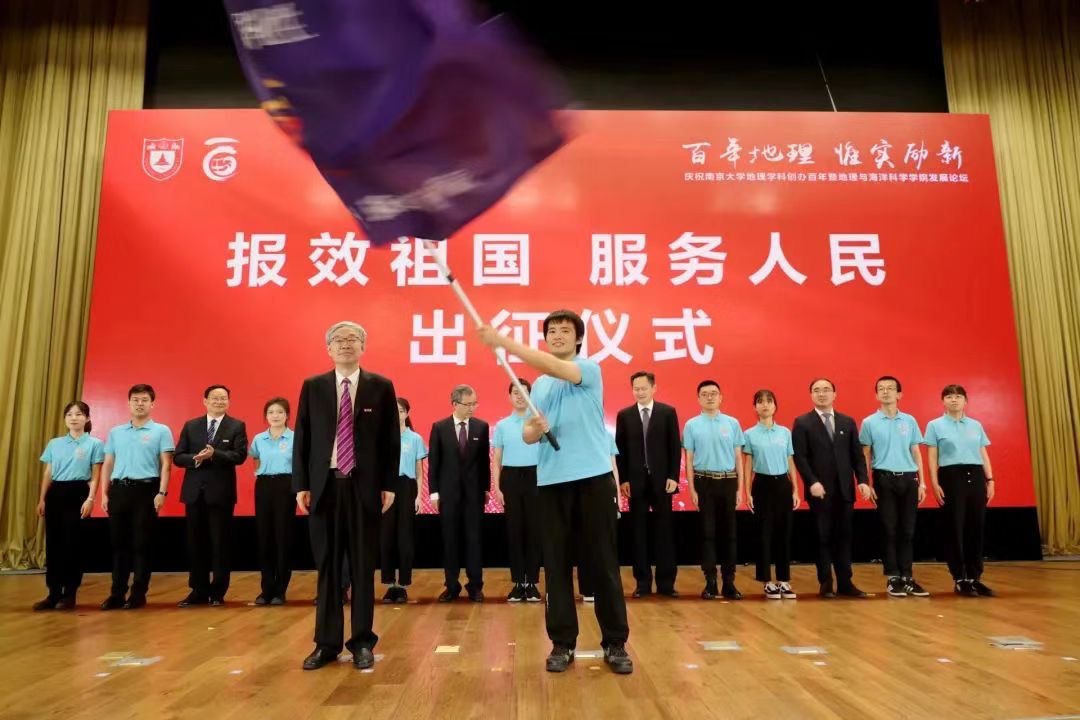 “报效祖国、服务人民,伟大征程,复兴有我!”正值毕业来临之际,2022届毕业生代表向学院献上生日祝福,以铿锵有力的誓词表达了赓续南大地理精神、在青春赛道奋力奔跑的决心。吕建为毕业生代表授旗。谈哲敏,邹亚军,校党委常委、研工部部长周济林,学工部部长葛俊杰向毕业生代表赠送百年院庆纪念章。