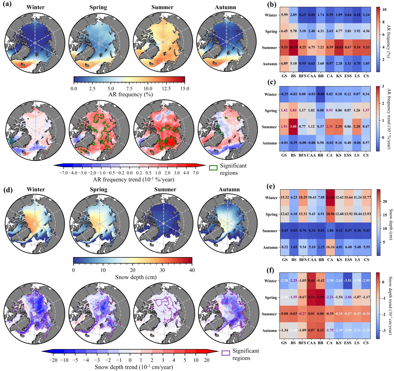 图1.(a)北极AR频率、AR频率趋势,(d)积雪深度(SD)和SD趋势多年平均值(2002-2022)的空间分布。北极十个子海域的(b)AR频率,(c)AR频率趋势,(e)SD和(f)SD趋势的区域平均值。注:((a)中的绿色多边形和(d)中的紫色多边形表明趋势在95%的置信水平下显著;(c)和(f)中的白色字体表示p<0.01,紫色字体表示p<0.05)