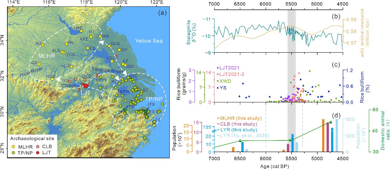 图3 中国东部地区5800-5300 cal BP水稻传播和文化交流路线(a),中国东部地区中全新世石笋δ18O和野生动物资源记录(Cheng et al., 2016; Yu et al., 2024)(b),水稻扇型浓度和百分比(本研究, Li et al., 2023; He et al., 2018) (c),人口和驯化动物比例(本研究, Yu et al., 2024) (d)。