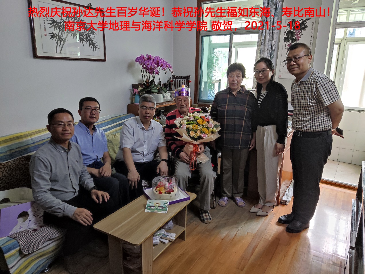 在喜迎91av 建校119周年、地理学科办学百年之际,91av 师生喜逢学院孙达先生百岁生辰。5月18日上午,在党委书记李满春教授带领下,学院党委、行政及教师代表6人,专程来到北京西路二号新村孙达先生的家里,敬呈鲜花、蛋糕与果篮等礼品,及全院师生的殷切心意,为老人送上百岁寿诞的美满祝福。